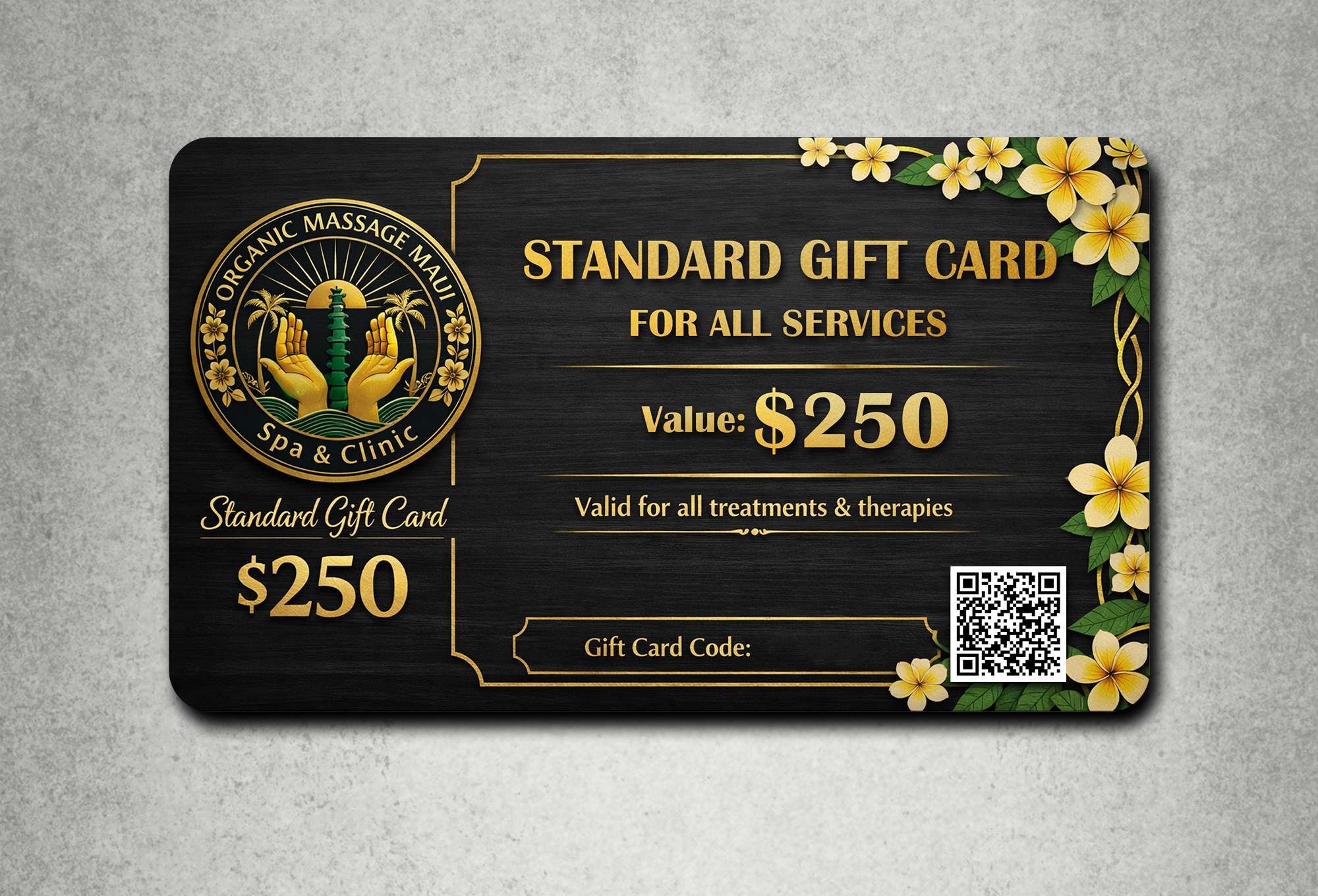 Elevate the gift of wellness with our $250 Standard Gift Card, designed for a deeper, more luxurious self-care experience. This card is valid for all Massage & Head Spa services at Organic Massage Maui.